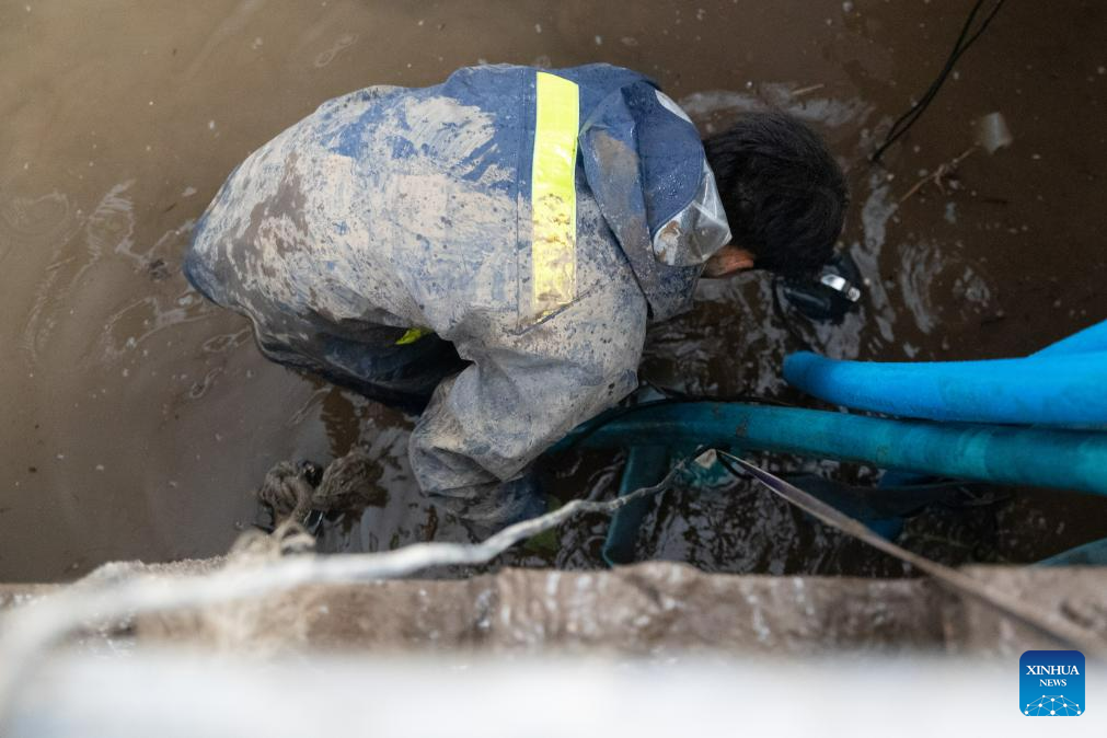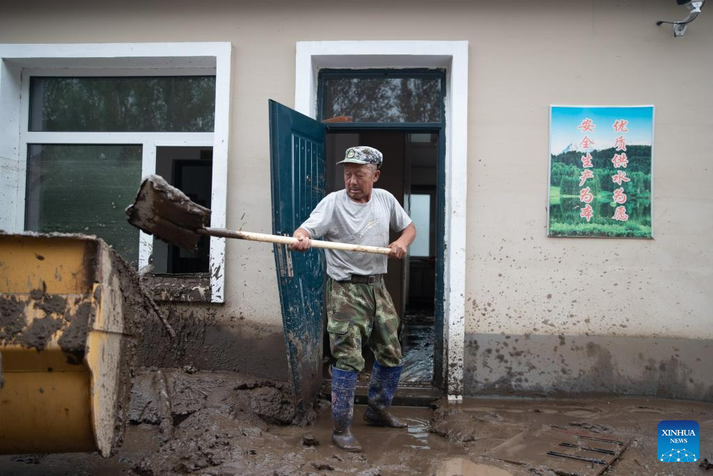 A staff member cleans sludge at a tap water station in Changting Township, Hailin City in northeast China's Heilongjiang Province, Aug. 6, 2023. Tap water and power supply has been interrupted in parts of Changting Township due to recent flooding, which also damaged some of the residences there. Residents and rescuers are working all out to put life back to normal. (Xinhua/Zhang Tao)