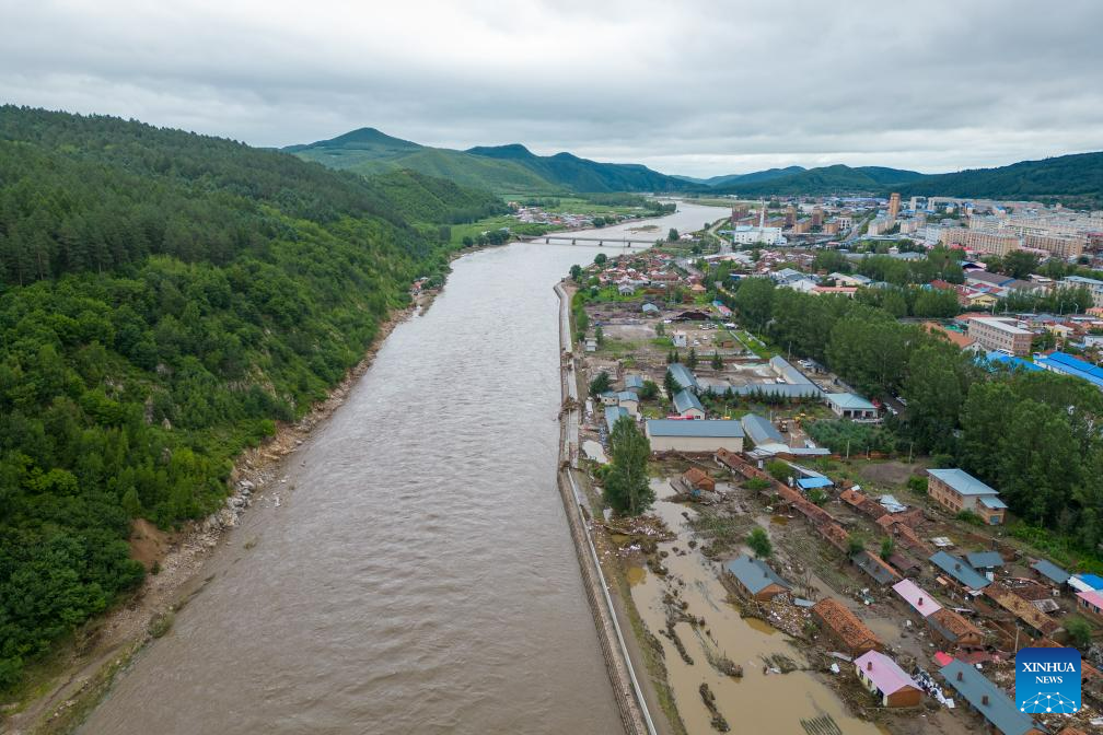 This aerial photo taken on Aug. 6, 2023 shows a view of flood-affected Changting Township, Hailin City in northeast China's Heilongjiang Province. Tap water and power supply has been interrupted in parts of Changting Township due to recent flooding, which also damaged some of the residences there. Residents and rescuers are working all out to put life back to normal. (Xinhua/Zhang Tao)