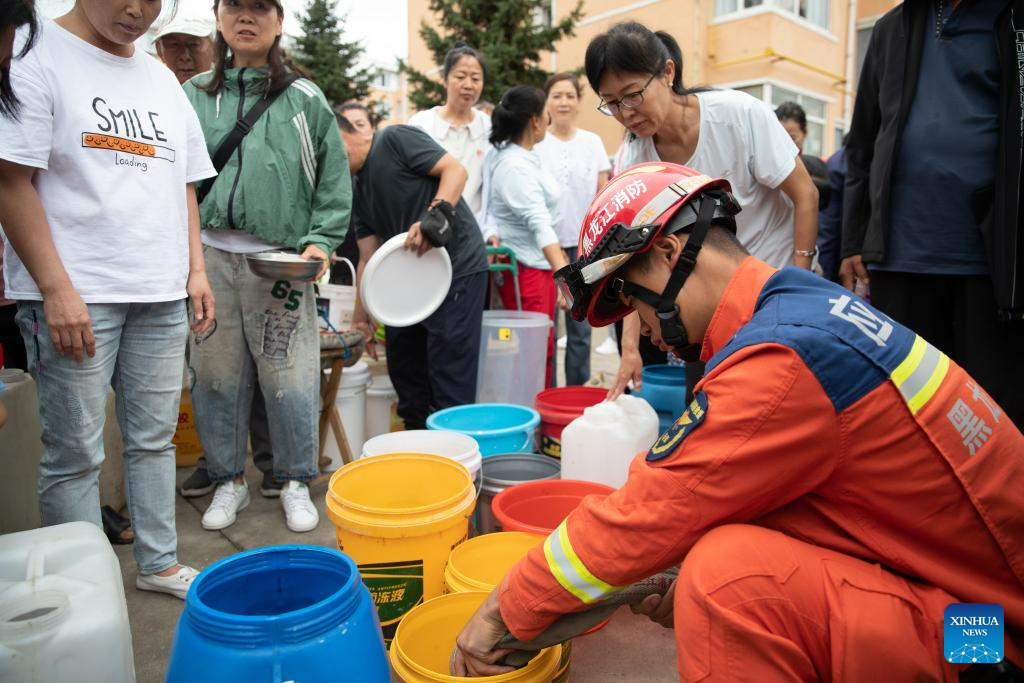 A rescuer dispenses fresh water at a community in Changting Township, Hailin City in northeast China's Heilongjiang Province, Aug. 6, 2023. Tap water and power supply has been interrupted in parts of Changting Township due to recent flooding, which also damaged some of the residences there. Residents and rescuers are working all out to put life back to normal. (Xinhua/Zhang Tao)