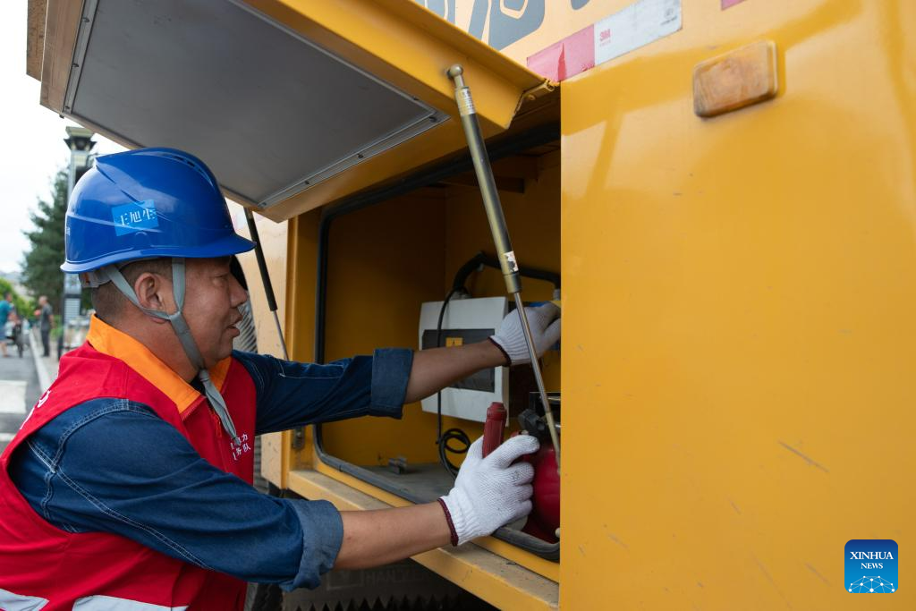 A staff member operates an emergency power supply unit in Changting Township, Hailin City in northeast China's Heilongjiang Province, Aug. 6, 2023. Tap water and power supply has been interrupted in parts of Changting Township due to recent flooding, which also damaged some of the residences there. Residents and rescuers are working all out to put life back to normal. (Xinhua/Zhang Tao)