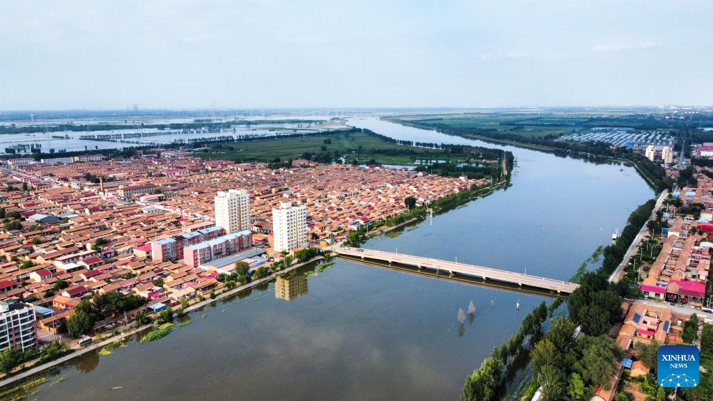 This aerial photo taken on Aug. 6, 2023 shows the Daqinghe River and villages at the north embankment of the river in north China's Tianjin. North China's Tianjin Municipality issued a red alert on Sunday, the highest level of warning, for possible floods in its Daqinghe River, a major tributary of the Haihe River, which is currently undergoing its worst flooding since 1963, said local authorities. (Xinhua/Sun Fanyue)