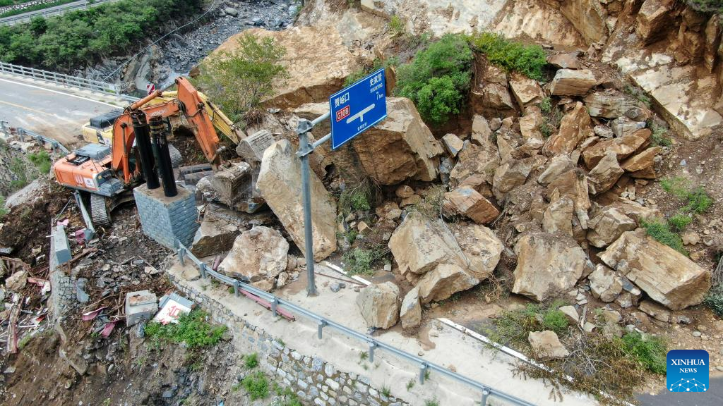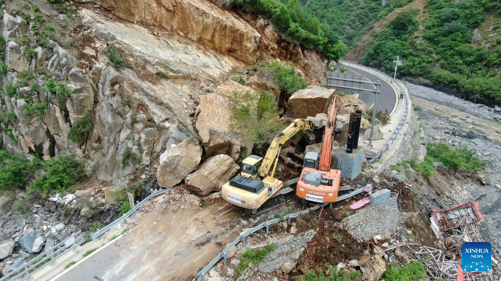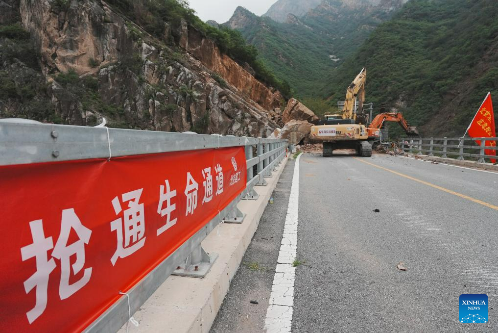 This aerial photo taken on Aug. 6, 2023 shows large machineries cleaning up falling rocks that block a road near Jinjitai Village in Shijiaying Town of Fangshan District in Beijing, capital of China. Beijing has been speeding up the restoration of roads damaged in flood-hit areas, to assist with rescue and relief efforts. (Xinhua/Ju Huanzong)