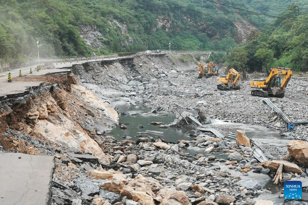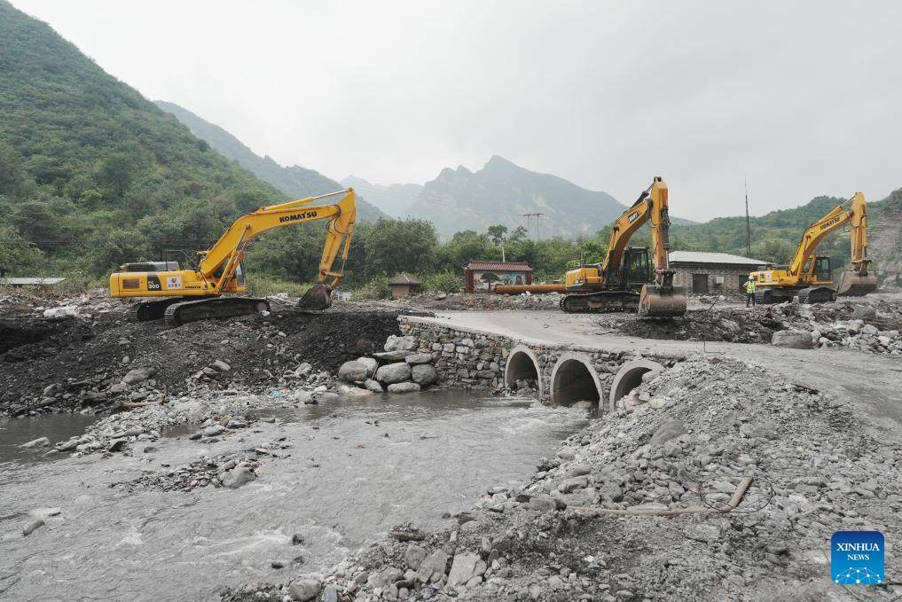 This photo taken on Aug. 6, 2023 shows large machineries moving in a watercourse to carry out restoration work in Shijiaying Town of Fangshan District in Beijing, capital of China. Beijing has been speeding up the restoration of roads damaged in flood-hit areas, to assist with rescue and relief efforts. (Xinhua/Ju Huanzong)