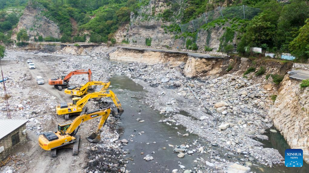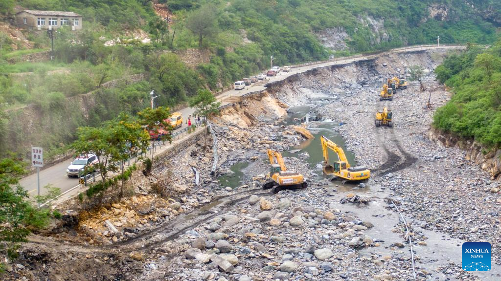 This aerial photo taken on Aug. 6, 2023 shows large machineries carrying out restoration work in a watercourse in Shijiaying Town of Fangshan District in Beijing, capital of China, Aug. 6, 2023. Beijing has been speeding up the restoration of roads damaged in flood-hit areas, to assist with rescue and relief efforts. (Xinhua/Ju Huanzong)