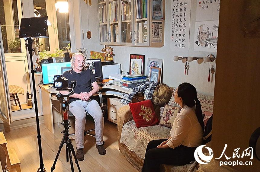 A People's Daily Online journalist interviews a Russian sinologist. (People's Daily Online/Liu Fan)