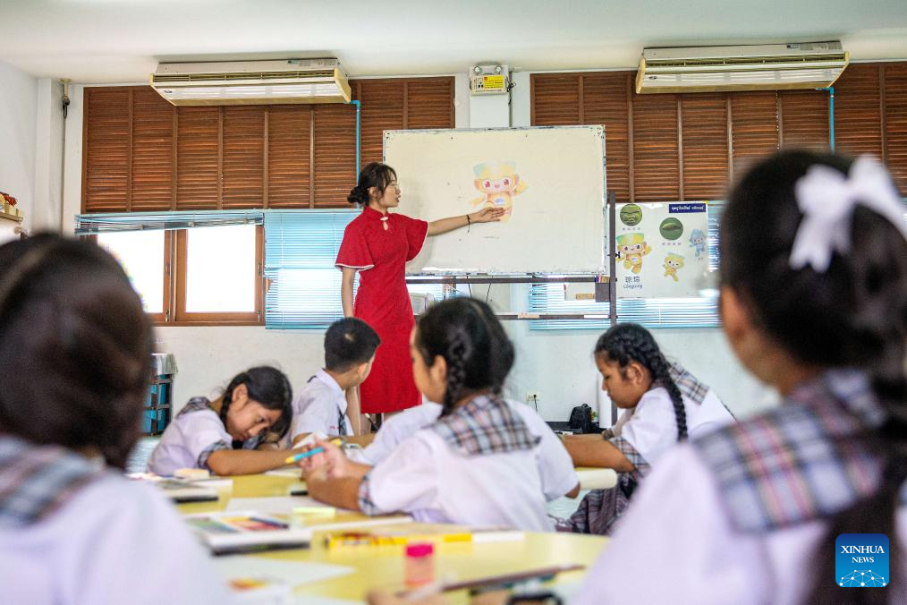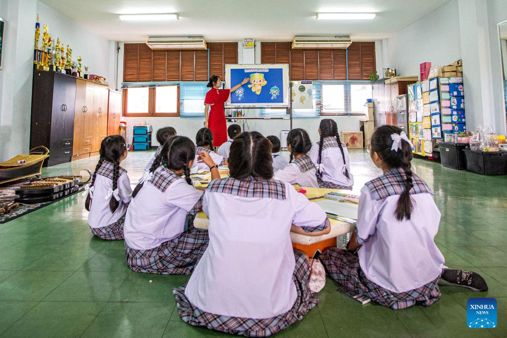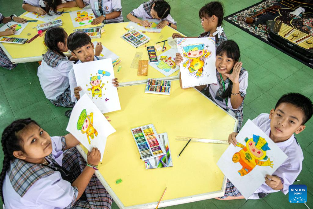 A teacher teaches students of the Samchaiwitaedsuksa School how to draw the mascots of the Hangzhou Asian Games in Samut Sakhon, Thailand, Aug. 4, 2023. (Xinhua/Wang Teng)