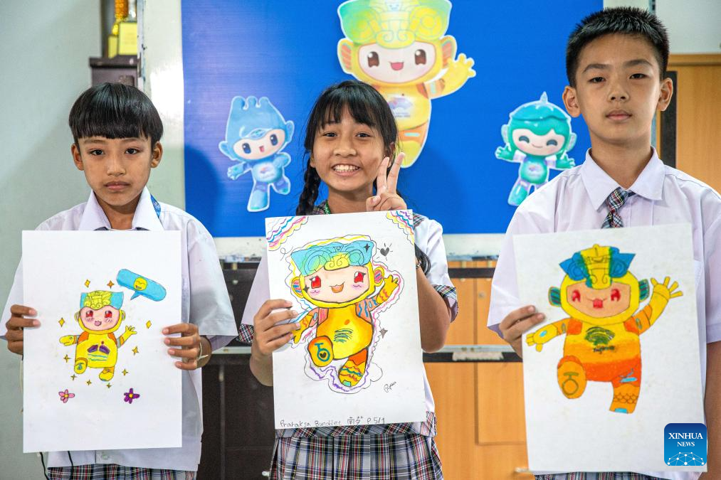 Students of the Samchaiwitaedsuksa School show the painted mascots of the Hangzhou Asian Games in Samut Sakhon, Thailand, Aug. 4, 2023. (Xinhua/Wang Teng)