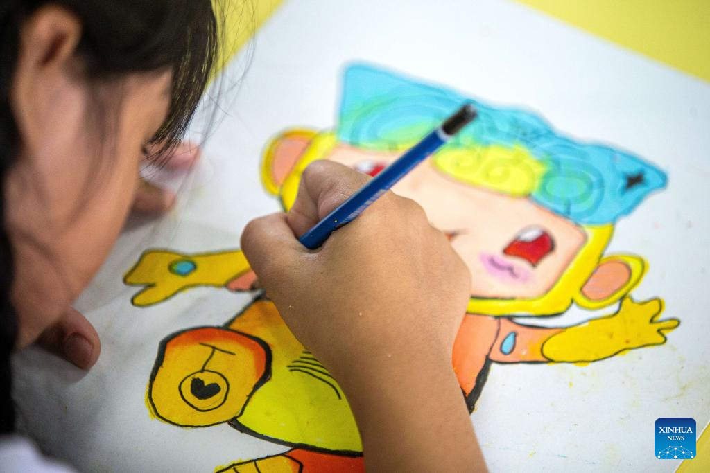 A student of the Samchaiwitaedsuksa School draws a mascot of the Hangzhou Asian Games in Samut Sakhon, Thailand, Aug. 4, 2023. (Xinhua/Wang Teng)