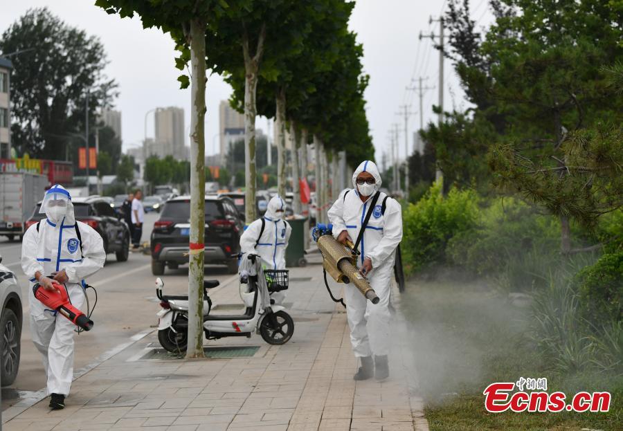 Volunteers perform outdoor disinfection in Zhuozhou, north China's Hebei Province, Aug. 6, 2023. (Photo: China News Service/Han Bing)