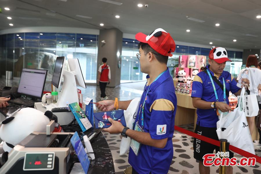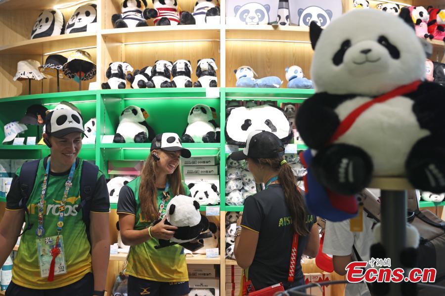 International athletes and officers shop in a souvenir store at the Chengdu Research Base of Giant Panda Breeding in southwest China's Sichuan Province, Aug. 5, 2023. (Photo: China News Service/Liu Zhankun)