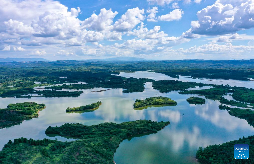 This aerial photo taken on Aug. 6, 2023 shows the scenery of Chongling National Wetland Park in Guiyang County, Chenzhou City, central China's Hunan Province. (Photo by Zhou Xiuyuchun/Xinhua)