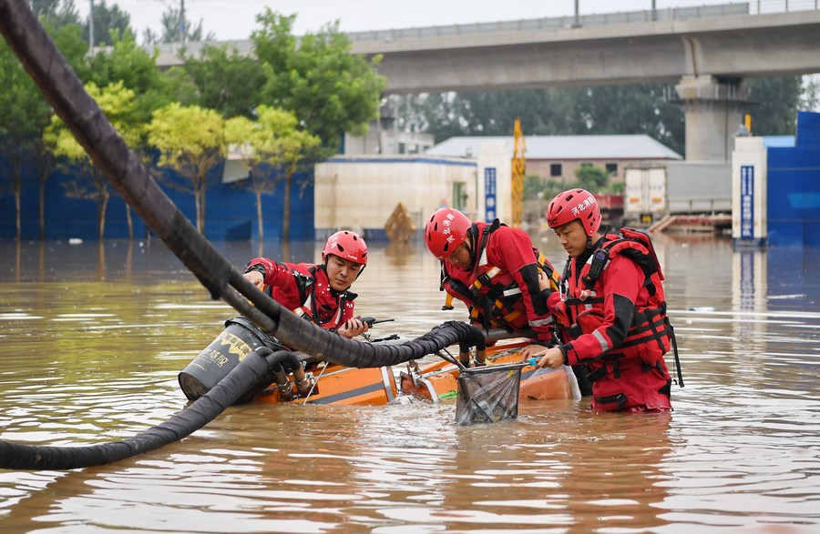 Rescuers perform drainage operation in downtown Zhuozhou, north China's Hebei Province, on Aug. 7, 2023. (Xinhua/Mu Yu)