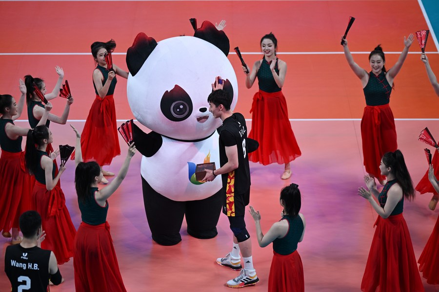 Li Yongzhen (C) of China celebrates his birthday after the men's volleyball bronze medal match against Iran at the Chengdu Universiade, August 7, 2023. (Xinhua/Xu Bingjie)