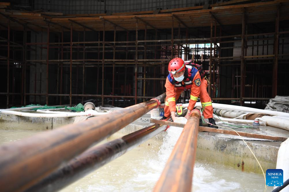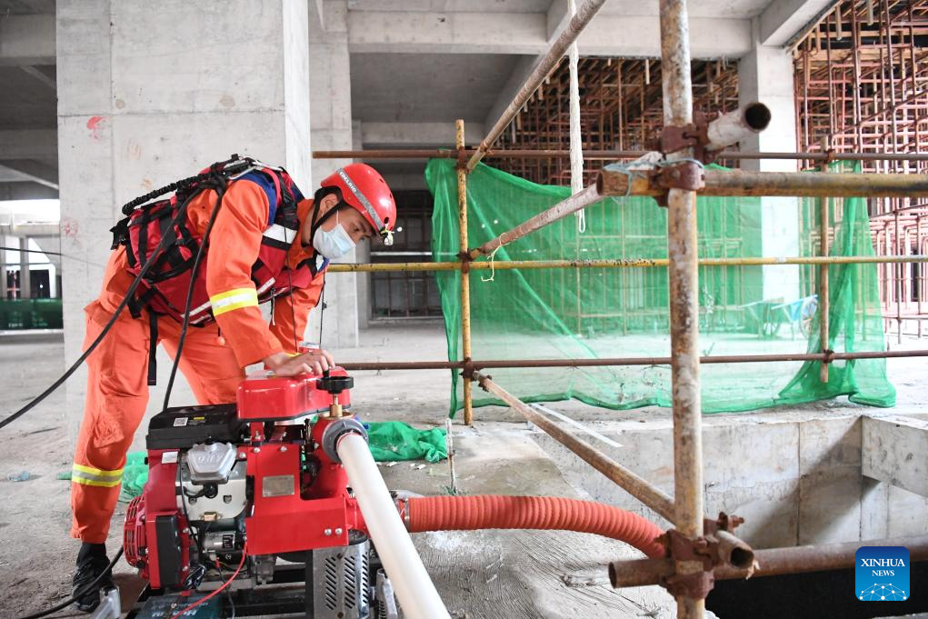 A rescuer performs drainage operation at a construction site in Zhuozhou City, north China's Hebei Province, Aug. 7, 2023. More than 800 rescuers redeployed from Tangshan, Handan, Hengshui and other cities of the province have been working around the clock in the most seriously flooded areas of Zhuozhou, trying to put life back to normal as soon as possible. (Xinhua/Zhu Xudong)