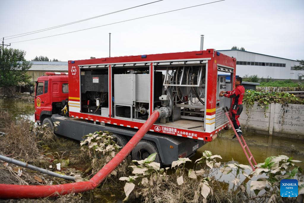 A rescuer performs drainage operation in Linjiatun Township of Zhuozhou, north China's Hebei Province, on Aug. 7, 2023. More than 800 rescuers redeployed from Tangshan, Handan, Hengshui and other cities of the province have been working around the clock in the most seriously flooded areas of Zhuozhou, trying to put life back to normal as soon as possible. (Xinhua/Mu Yu)