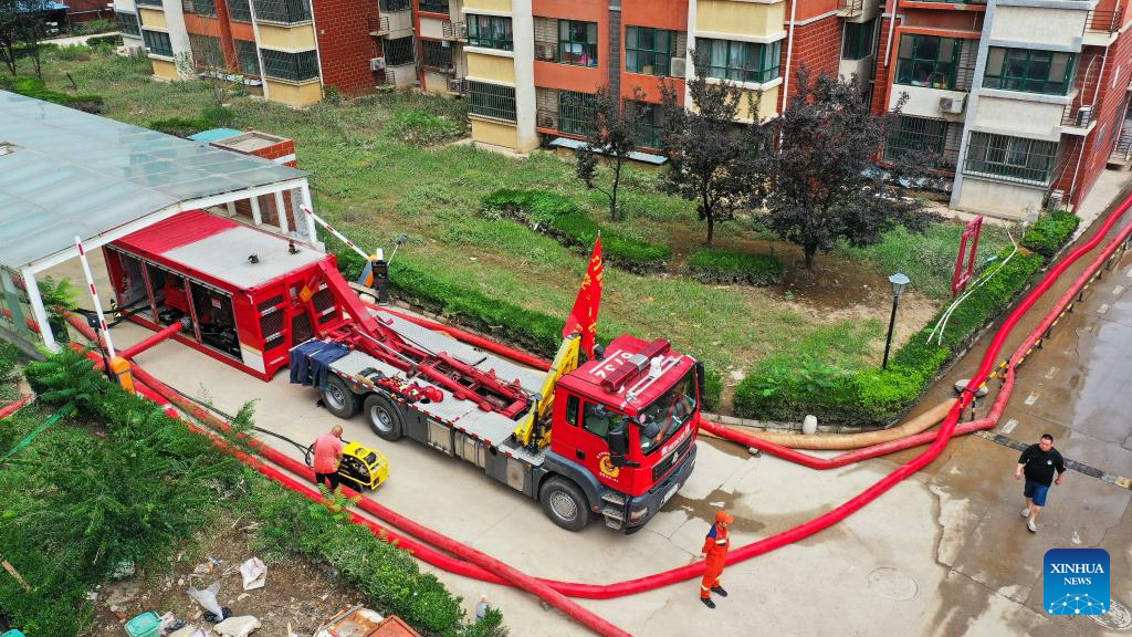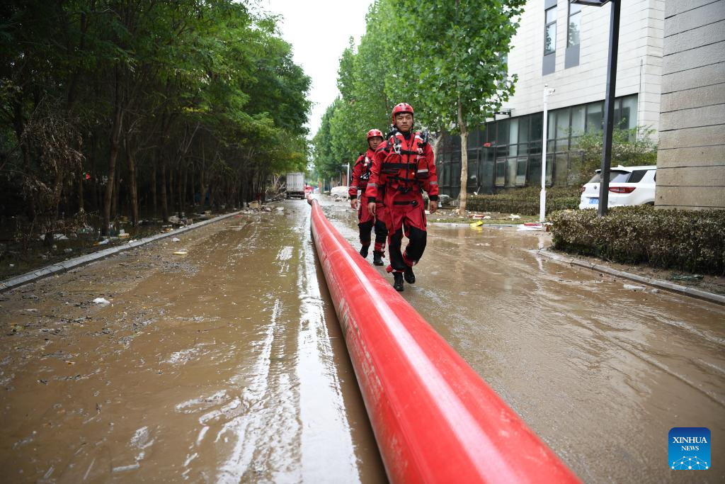 Rescuers perform drainage operation at an office building in Zhuozhou City, north China's Hebei Province, Aug. 7, 2023. More than 800 rescuers redeployed from Tangshan, Handan, Hengshui and other cities of the province have been working around the clock in the most seriously flooded areas of Zhuozhou, trying to put life back to normal as soon as possible. (Xinhua/Zhu Xudong)