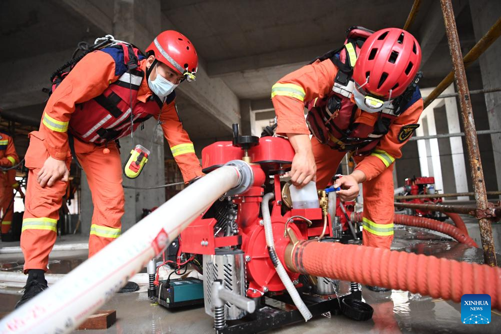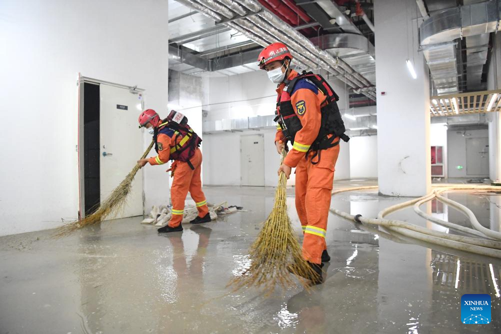 Rescuers perform drainage operation at an underground area of an office building in Zhuozhou City, north China's Hebei Province, Aug. 7, 2023. More than 800 rescuers redeployed from Tangshan, Handan, Hengshui and other cities of the province have been working around the clock in the most seriously flooded areas of Zhuozhou, trying to put life back to normal as soon as possible. (Xinhua/Zhu Xudong)