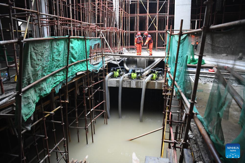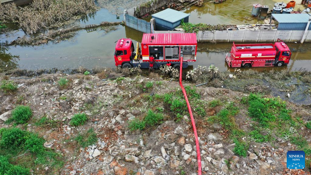 Rescuers check the drainage operation at a construction site in Zhuozhou City, north China's Hebei Province, Aug. 7, 2023. More than 800 rescuers redeployed from Tangshan, Handan, Hengshui and other cities of the province have been working around the clock in the most seriously flooded areas of Zhuozhou, trying to put life back to normal as soon as possible. (Xinhua/Zhu Xudong)