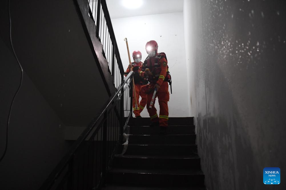 Rescuers check the water condition at an underground area of an office building in Zhuozhou City, north China's Hebei Province, Aug. 7, 2023. More than 800 rescuers redeployed from Tangshan, Handan, Hengshui and other cities of the province have been working around the clock in the most seriously flooded areas of Zhuozhou, trying to put life back to normal as soon as possible. (Xinhua/Zhu Xudong)