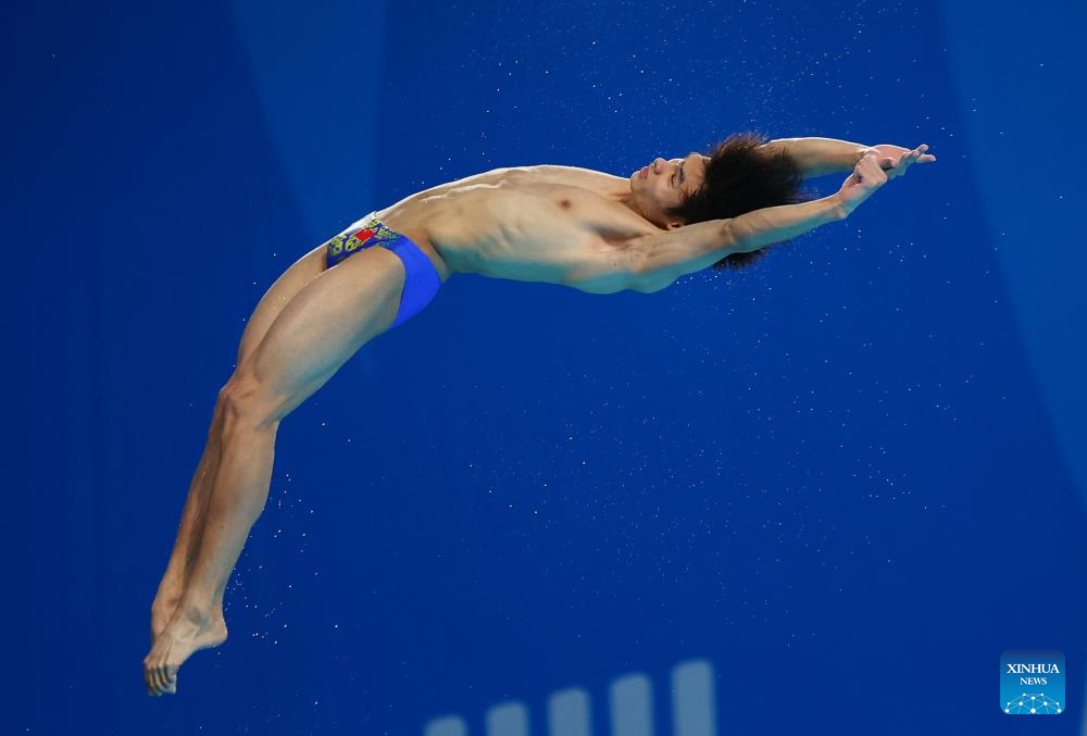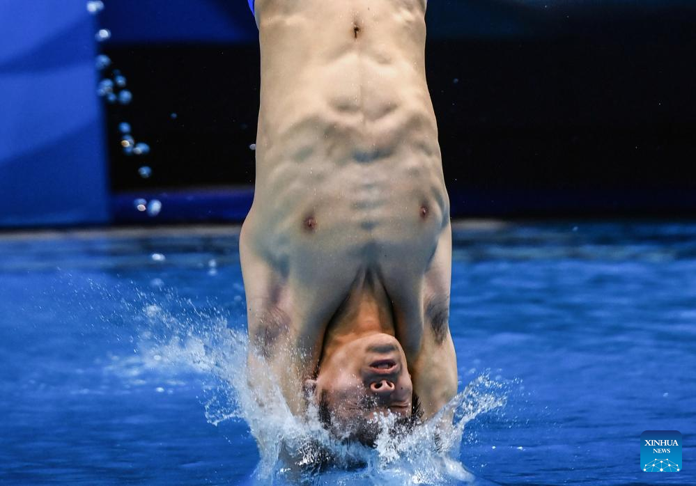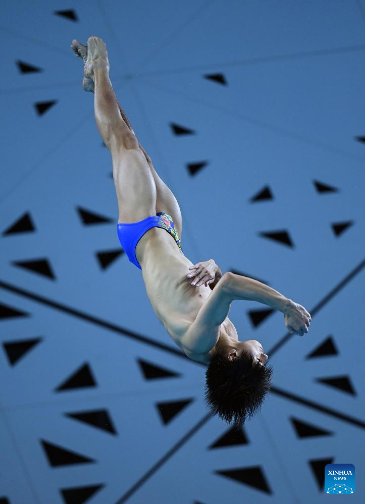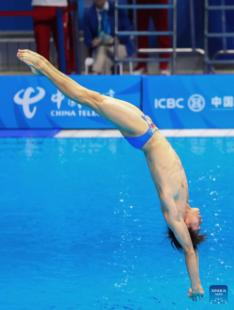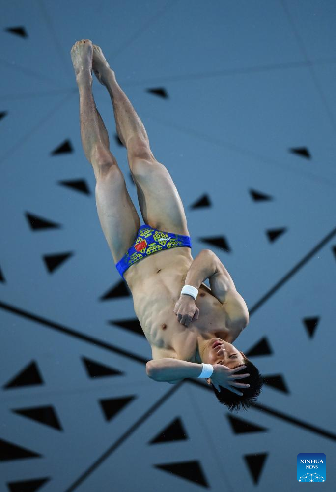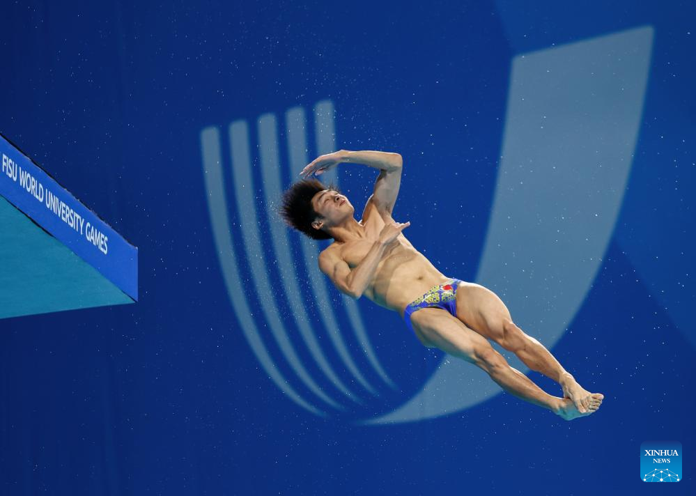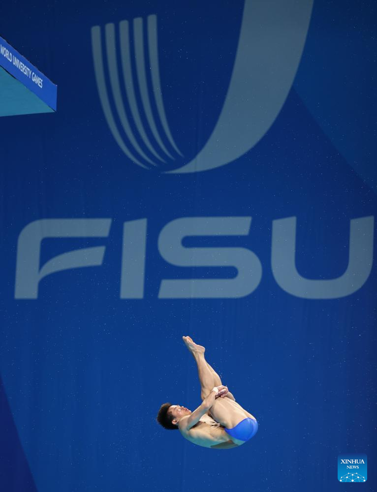 Huang Zigan of China competes during the men's 10m platform final of diving at the 31st FISU Summer World University Games in Chengdu, southwest China's Sichuan Province, Aug. 7, 2023. (Xinhua/Liu Kun)