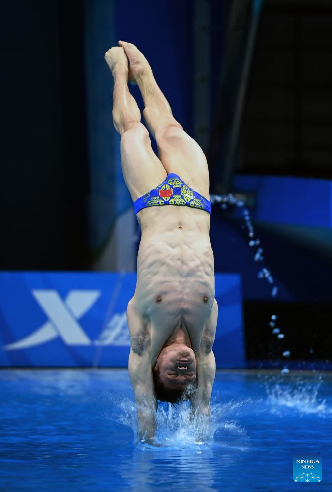 Yang Ling of China competes during the men's 10m platform final of diving at the 31st FISU Summer World University Games in Chengdu, southwest China's Sichuan Province, Aug. 7, 2023. (Xinhua/Wang Xiang)