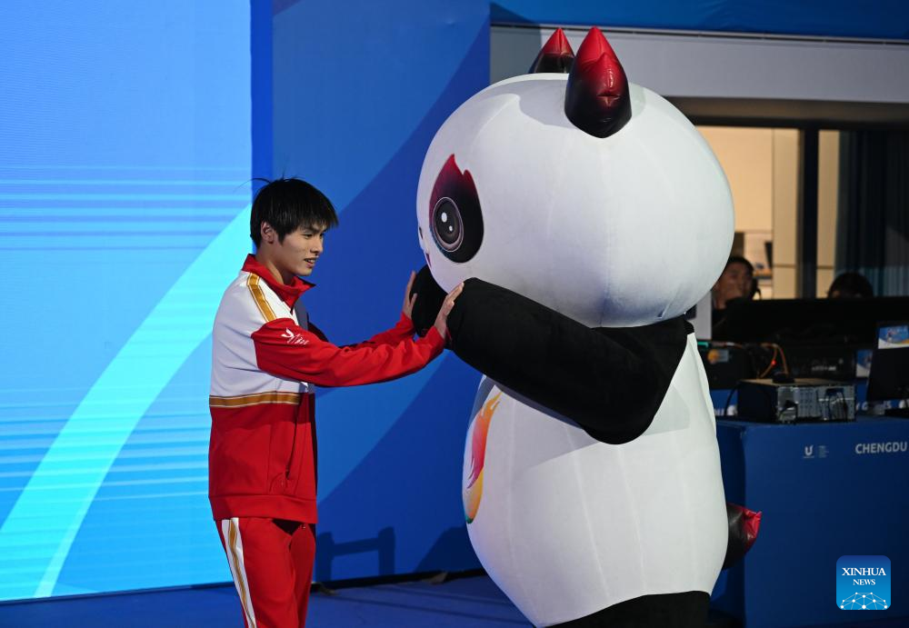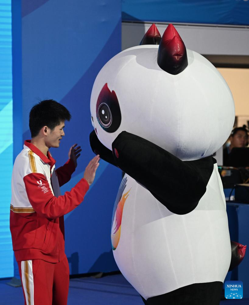 Huang Zigan of China greets the mascot Rongbao before the men's 10m platform final of diving at the 31st FISU Summer World University Games in Chengdu, southwest China's Sichuan Province, Aug. 7, 2023. (Xinhua/Liu Kun)
