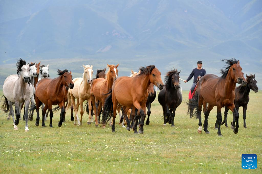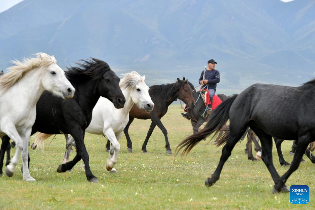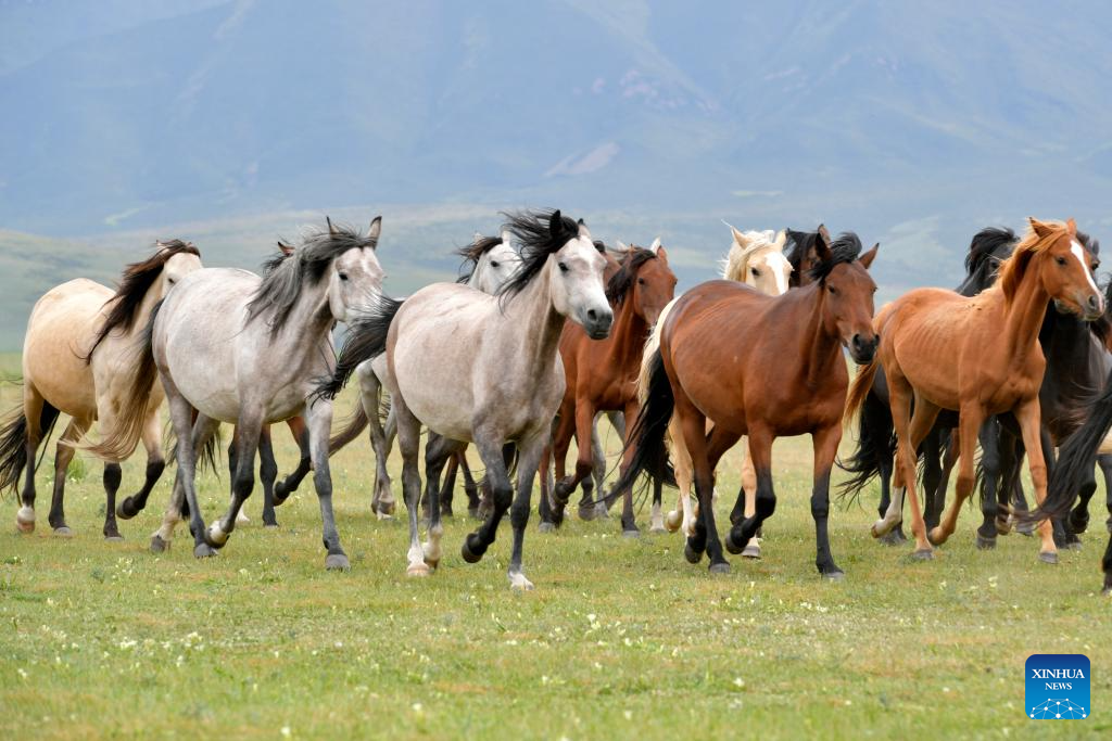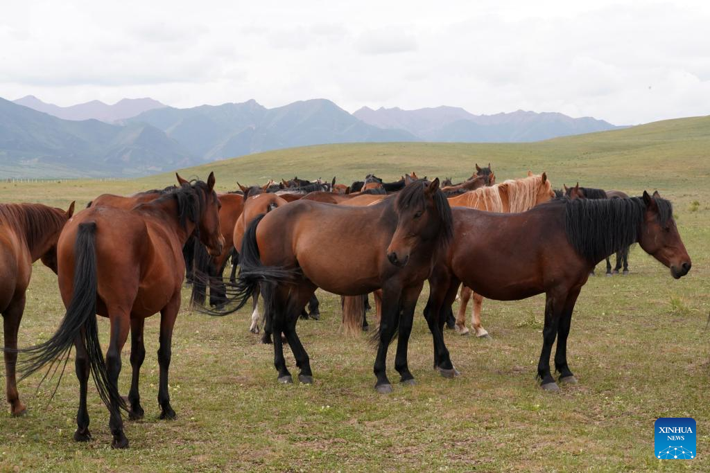 This photo taken on Aug. 6, 2023 shows Shandan horses at the Shandan Horse Breeding Farm in Shandan County, Zhangye City, northwest China's Gansu Province. Lying at the foothill of the Qilian Mountains, the Shandan Horse Breeding Farm has a history of over 2,000 years and now serves as a major horse breeding facility in China. Shandan horse, a species exclusively bred by the farm, boasts physical fitness and good endurance. (Xinhua/Fan Peishen)