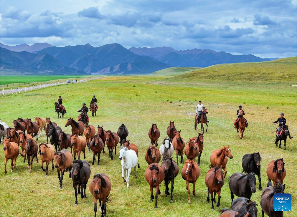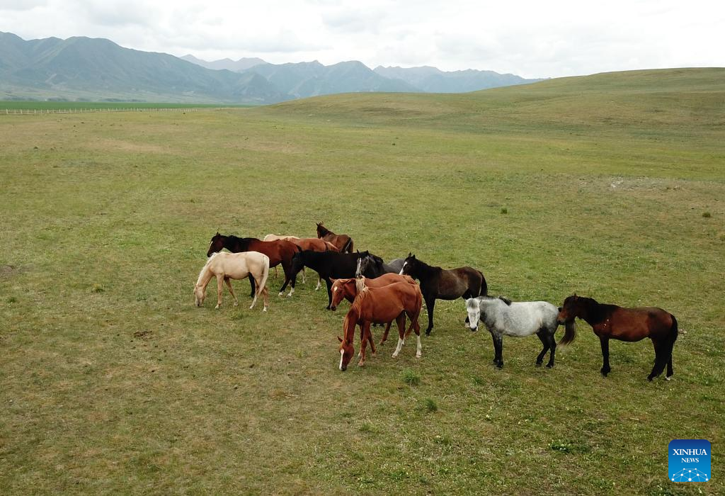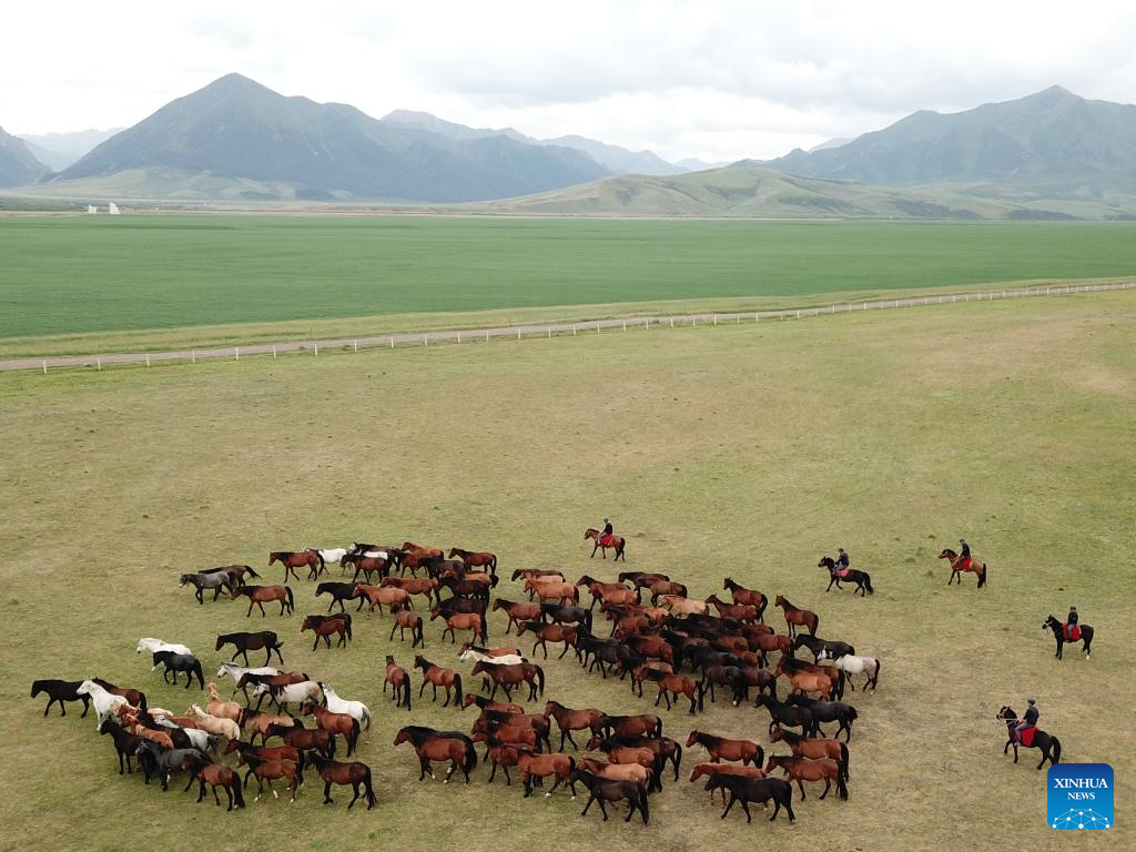 This aerial photo taken on Aug. 6, 2023 shows Shandan horses at the Shandan Horse Breeding Farm in Shandan County, Zhangye City, northwest China's Gansu Province. Lying at the foothill of the Qilian Mountains, the Shandan Horse Breeding Farm has a history of over 2,000 years and now serves as a major horse breeding facility in China. Shandan horse, a species exclusively bred by the farm, boasts physical fitness and good endurance. (Xinhua/Ma Ning)