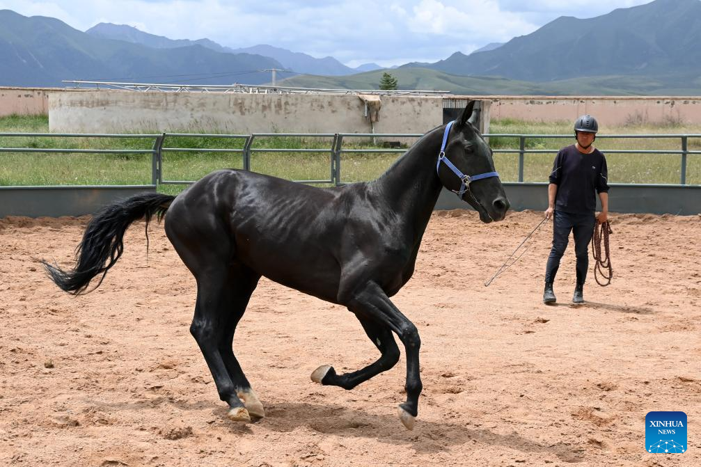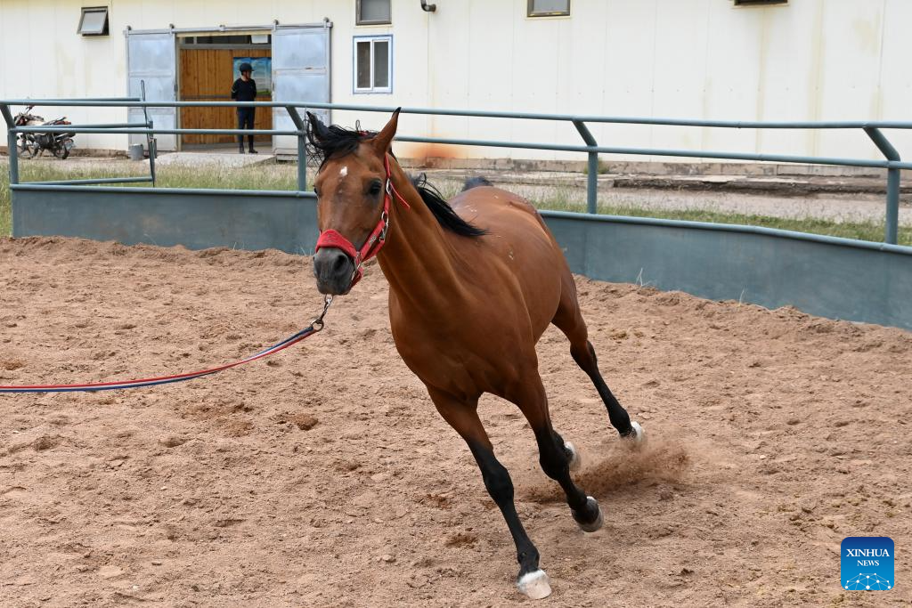 This photo taken on Aug. 6, 2023 shows a Shandan stallion at the Shandan Horse Breeding Farm in Shandan County, Zhangye City, northwest China's Gansu Province. Lying at the foothill of the Qilian Mountains, the Shandan Horse Breeding Farm has a history of over 2,000 years and now serves as a major horse breeding facility in China. Shandan horse, a species exclusively bred by the farm, boasts physical fitness and good endurance. (Xinhua/Fan Peishen)