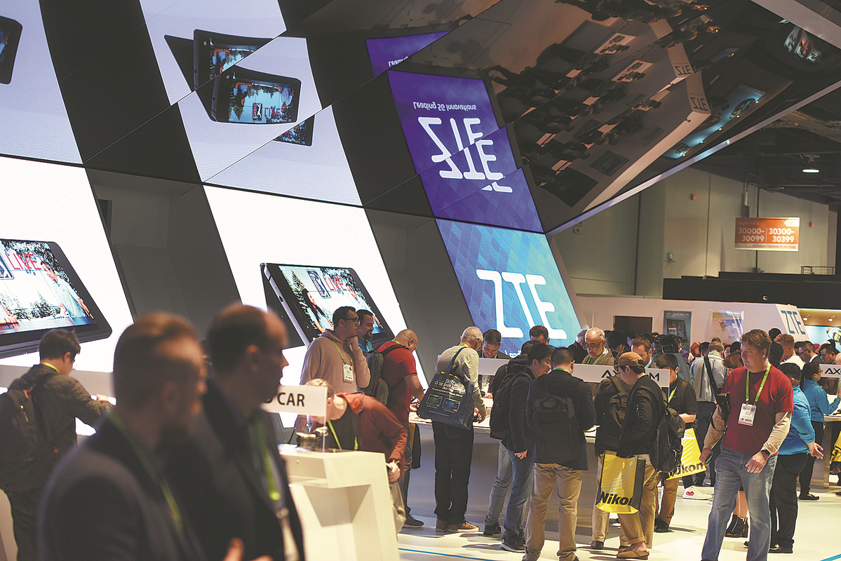 People visit the ZTE booth at the Consumer Electronic Show in Las Vegas, Nevada, on Jan 9, 2018. ZHANG SHUO/CHINA NEWS SERVICE