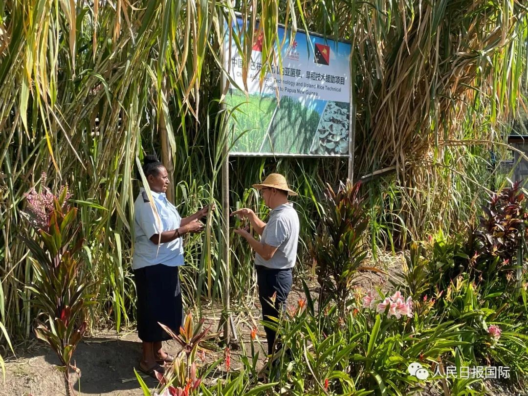 A Chinese expert instructs a farmer in Papua New Guinea to grow Juncao. (Photo by Chen Xiaowei/People's Daily)