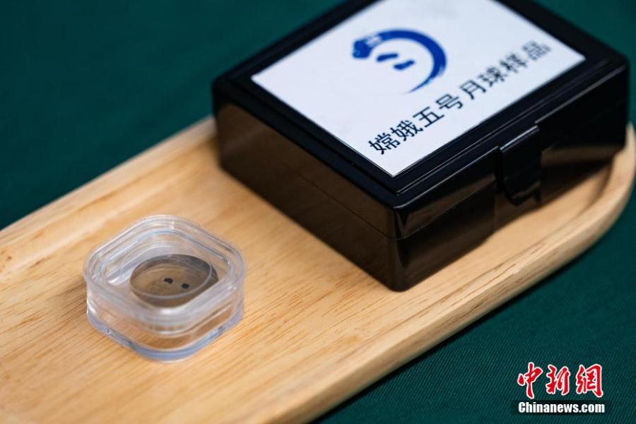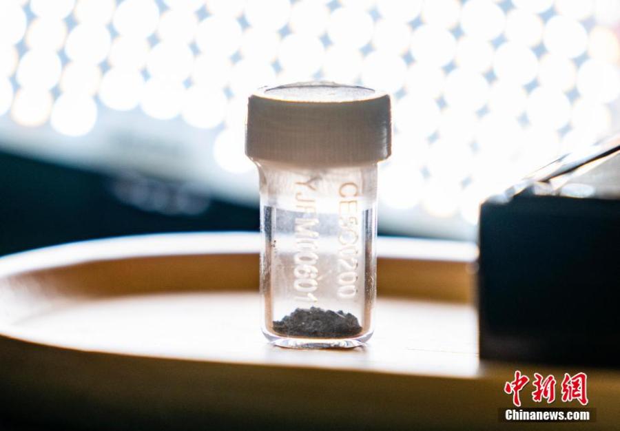 Lunar soil samples collected by the Chinese lunar probe Chang'e-5 are displayed in the University of Hong Kong, Aug. 7, 2023. (Photo: China News Service/Hou Yu)