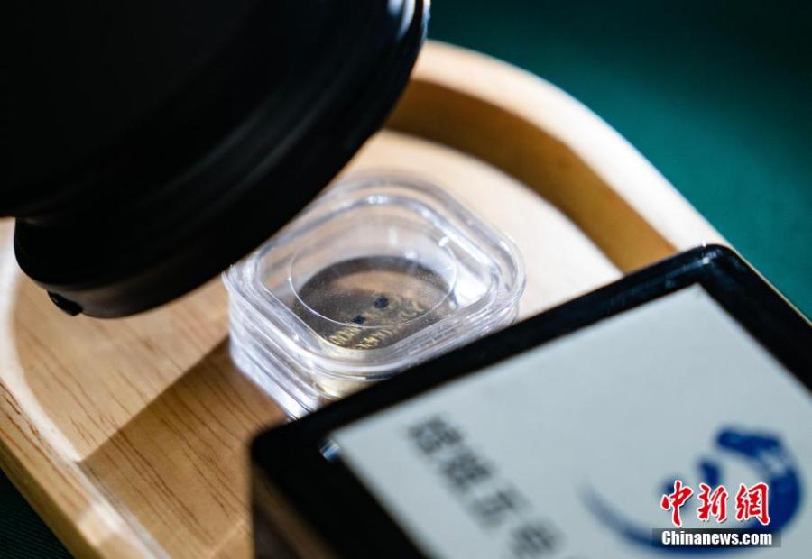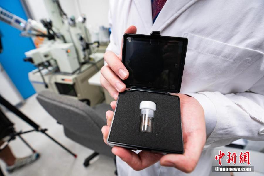 Doctor Yuqi Qian displays one of the lunar soil samples he retrieved from Beijing in the University of Hong Kong, Aug. 7, 2023. (Photo: China News Service/Hou Yu)
