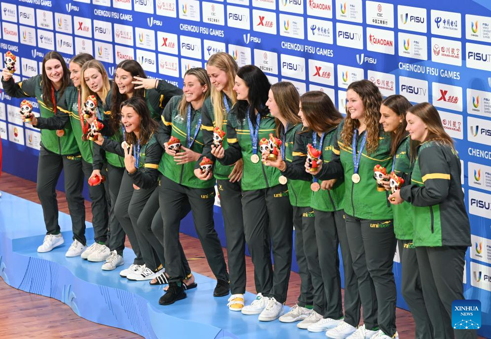Bronze medalists team Australia pose during the awarding ceremony for the women's water polo event at the 31st FISU Summer World University Games in Chengdu, southwest China's Sichuan Province, Aug. 7, 2023. (Xinhua/Liu Lei)