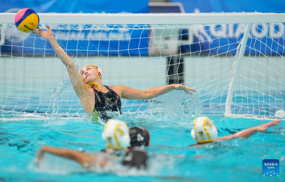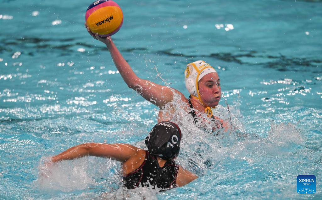 Lucinda Josephine Marsh (top) of Australia competes during the water polo women's bronze medal match between Australia and Japan at the 31st FISU Summer World University Games in Chengdu, southwest China's Sichuan Province, Aug. 7, 2023. (Xinhua/Liu Lei)
