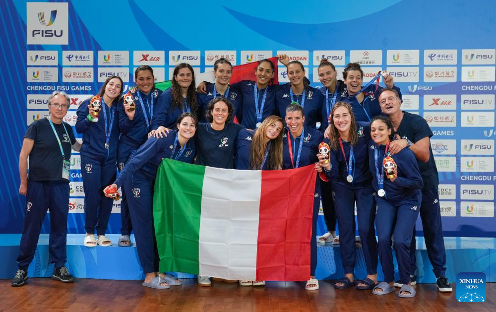 Silver medalists team Italy pose during the awarding ceremony for the women's water polo event at the 31st FISU Summer World University Games in Chengdu, southwest China's Sichuan Province, Aug. 7, 2023. (Xinhua/Jiang Hongjing)