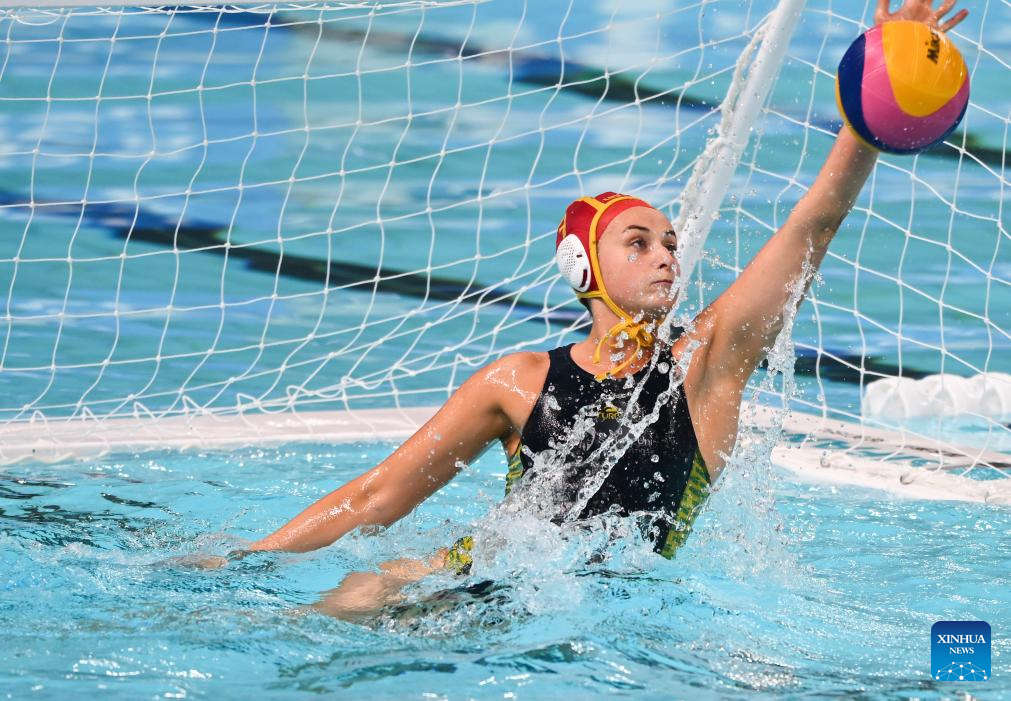 Isobelle Christina Pamp, goalkeeper of Australia, competes during the water polo women's bronze medal match between Australia and Japan at the 31st FISU Summer World University Games in Chengdu, southwest China's Sichuan Province, Aug. 7, 2023. (Xinhua/Liu Lei)