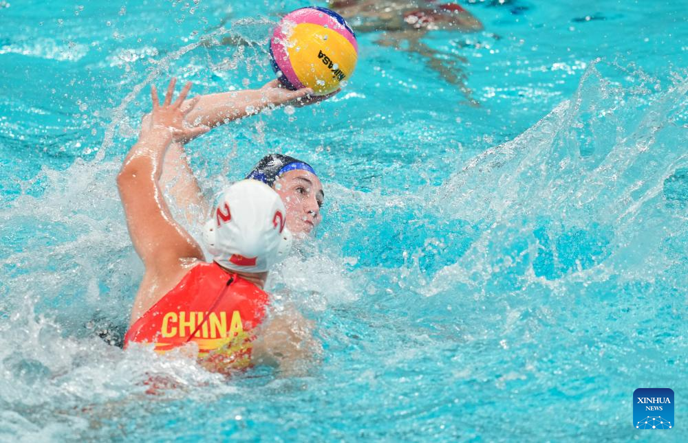 Wang Shiyun (C) of China vies with Cecilia Nardini (L) of Italy during the water polo women's gold medal match between China and Italy at the 31st FISU Summer World University Games in Chengdu, southwest China's Sichuan Province, Aug. 7, 2023. (Xinhua/Jiang Hongjing)