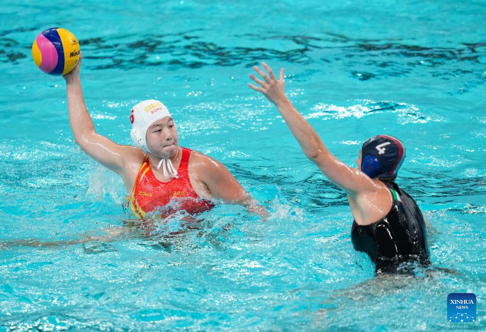 Letizia Nesti (R) of Italy competes during the water polo women's gold medal match between China and Italy at the 31st FISU Summer World University Games in Chengdu, southwest China's Sichuan Province, Aug. 7, 2023. (Xinhua/Liu Lei)