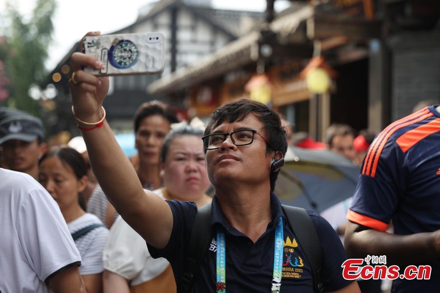 Members of the international delegations pose for group photos at Kuanzhai Alley in Chengdu, southwest China's Sichuan Province, Aug. 7, 2023. (Photo: China News Service/Liu Zhankun)