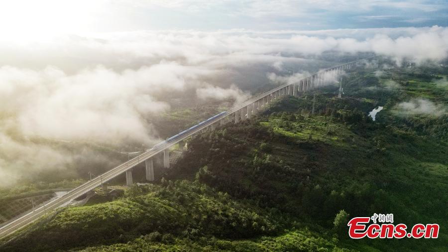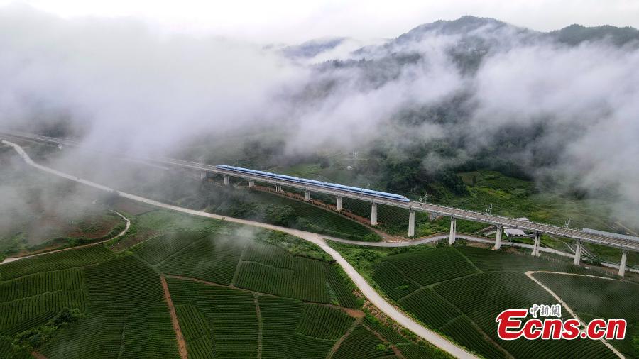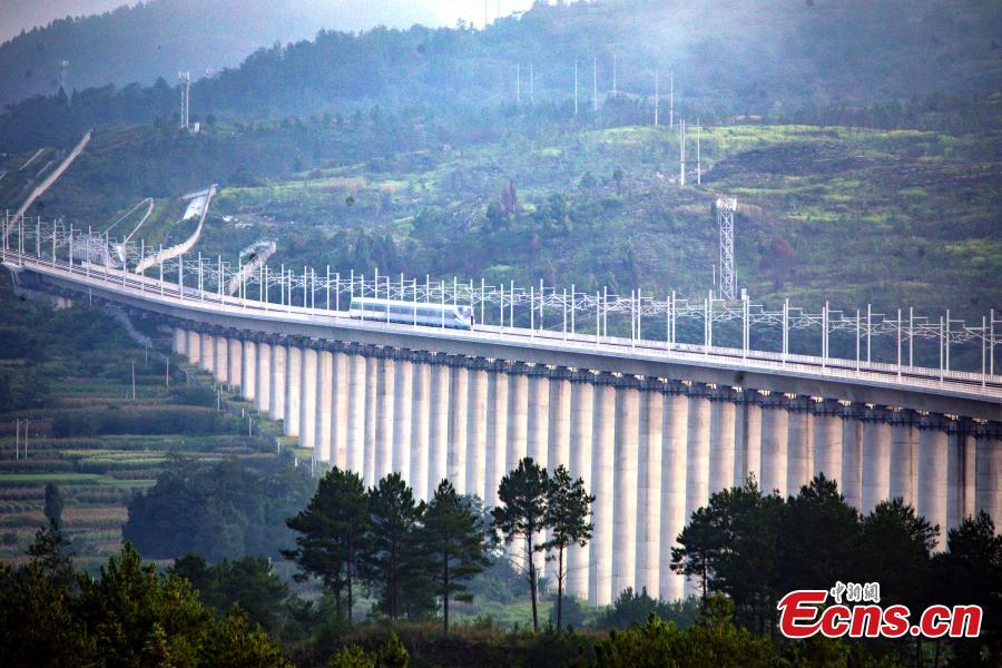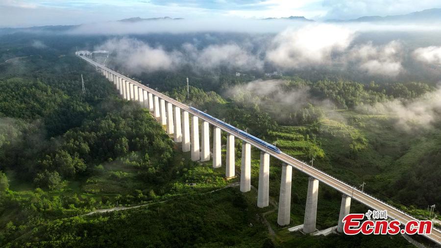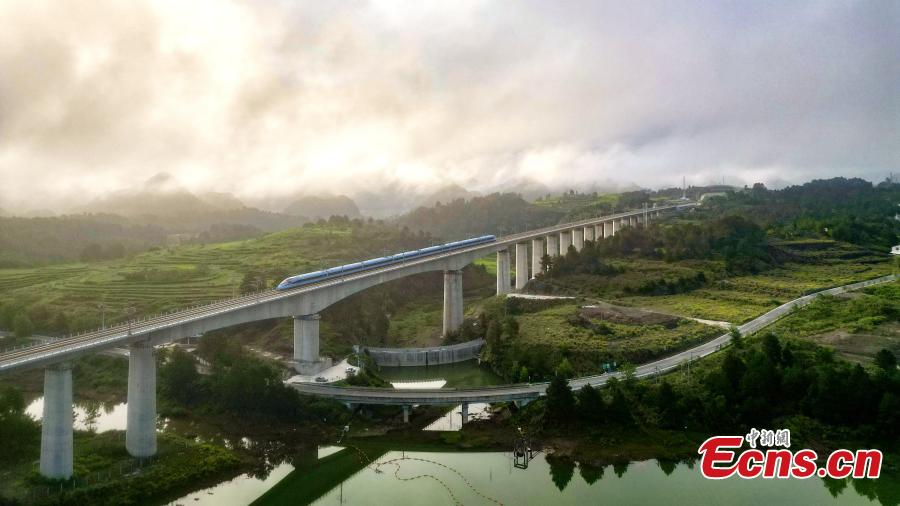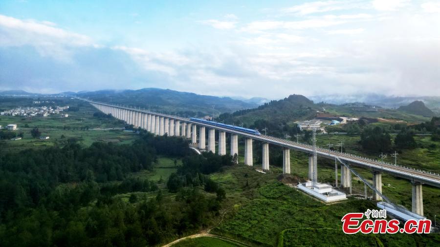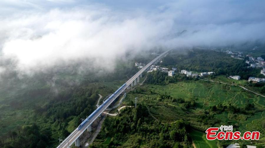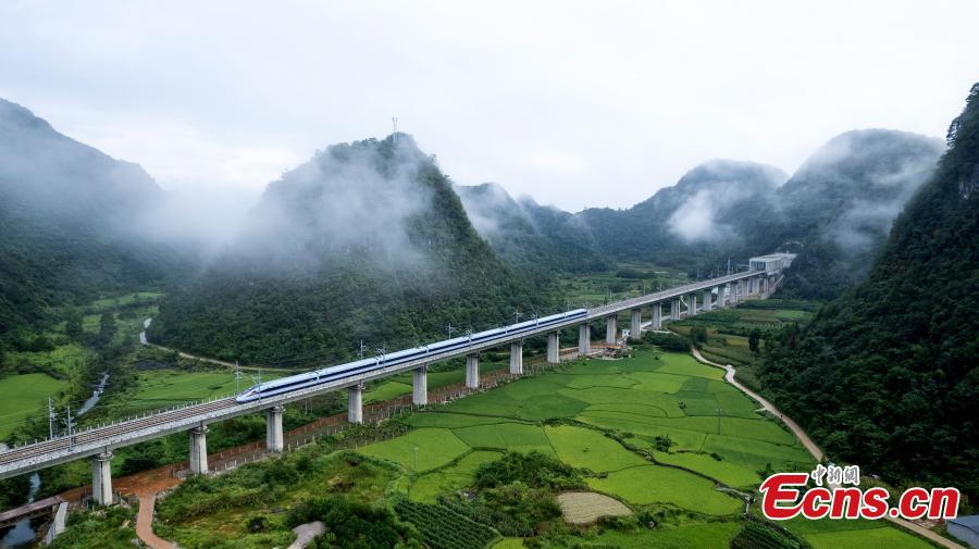 The first high-speed train D6171 runs on Yinpo River Grand Bridge in southwest China's Guizhou Province, Aug. 8, 2023. (Photo: China News Service/Cai Chaoyang)