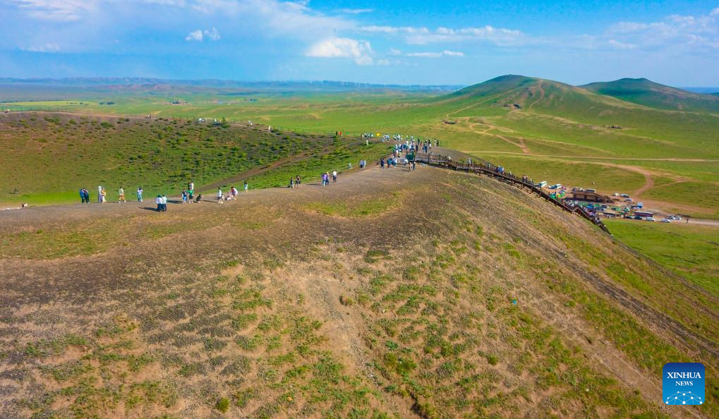 Tourists visit the Ulanhada volcano cluster in Qahar Right Wing Rear Banner of Ulanqab, north China's Inner Mongolia Autonomous Region, Aug. 6, 2023. The Ulanhada volcano cluster has special geological landscapes such as volcanoes and lava landform. (Xinhua/Peng Yuan)