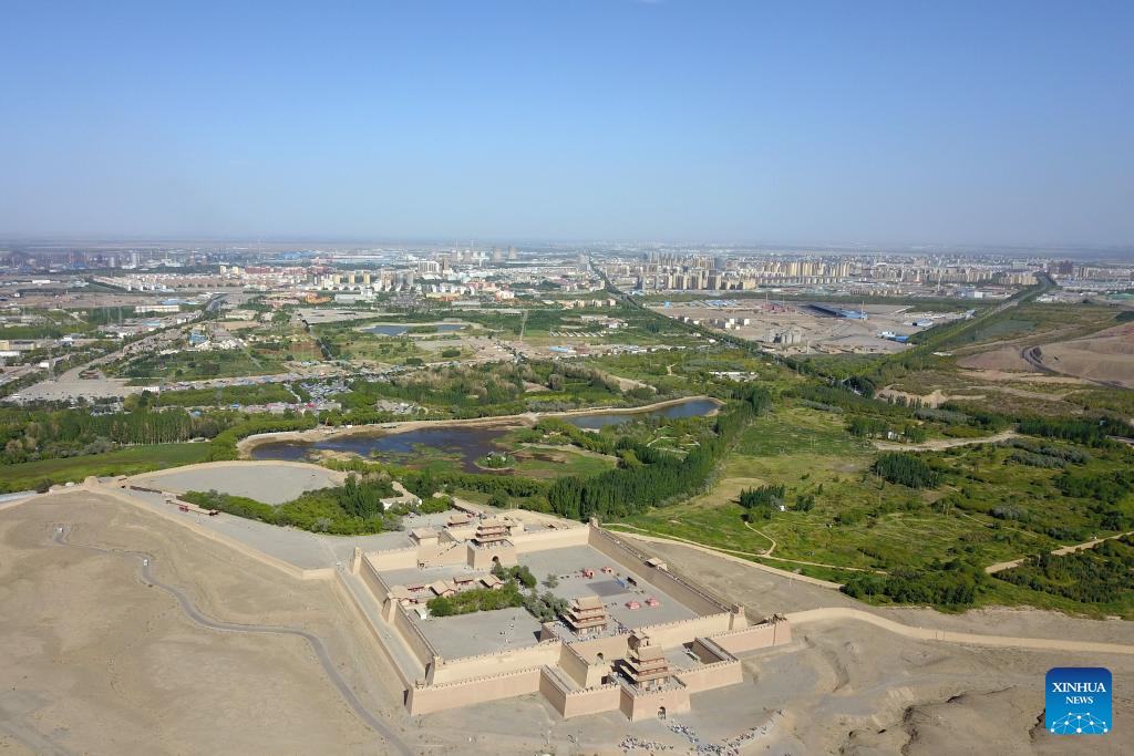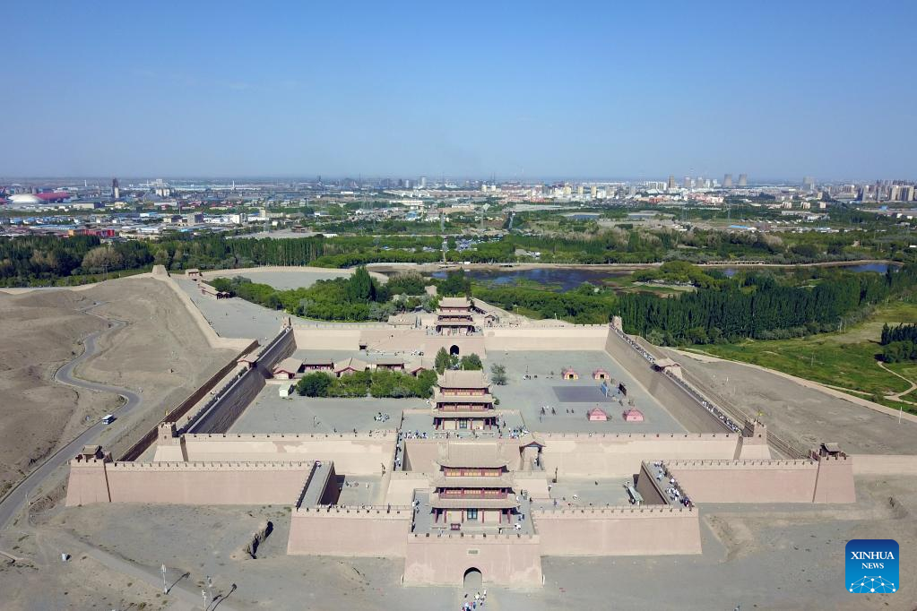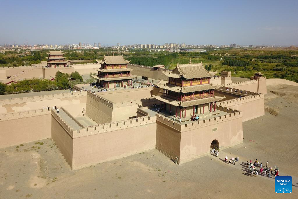 This aerial photo taken on Aug. 7, 2023 shows the Jiayu Pass in Jiayuguan City, northwest China's Gansu Province. The Jiayu Pass, a famed part of the Great Wall built in the Ming Dynasty (1368-1644), has attracted an increasing number of visitors during the summer tourist season with over 30,000 visitors daily at peak. (Xinhua/Zhang Keren)
