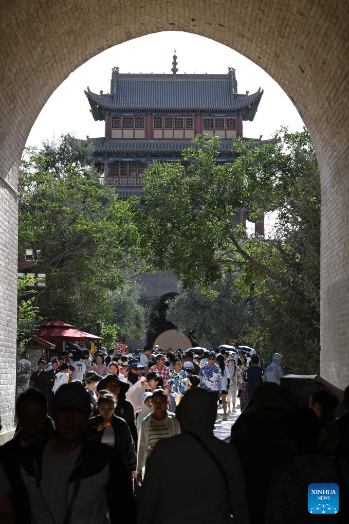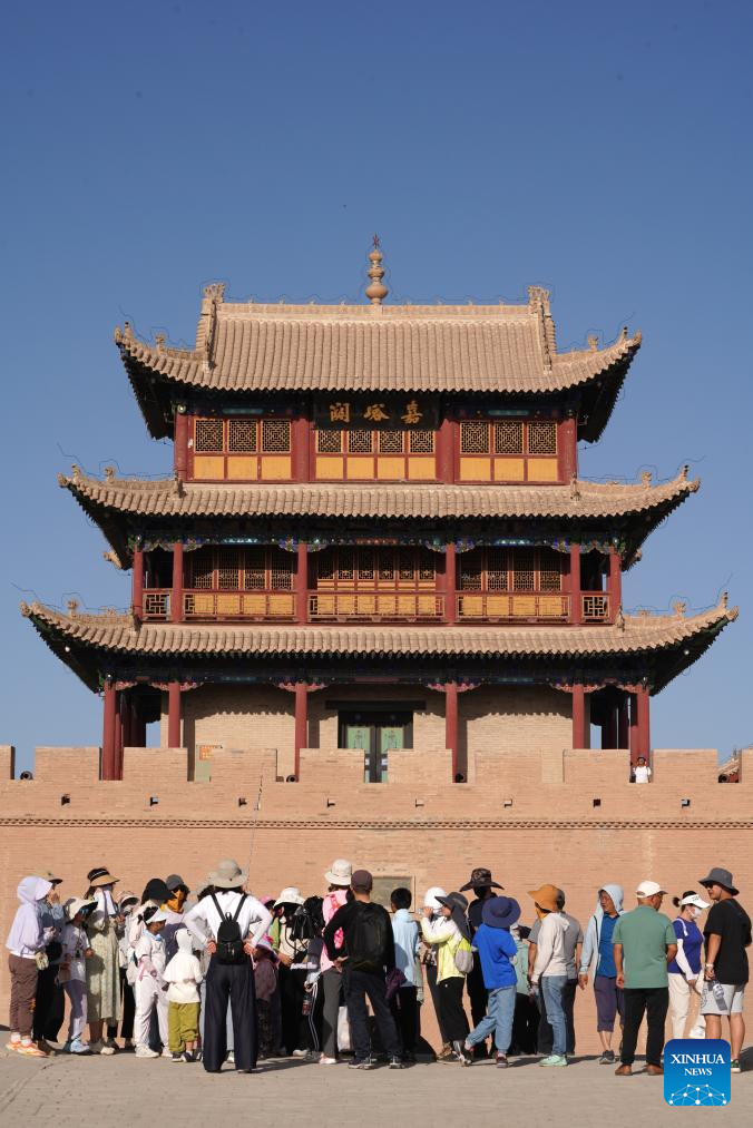 Tourists visit the Jiayu Pass in Jiayuguan City, northwest China's Gansu Province, Aug. 7, 2023. The Jiayu Pass, a famed part of the Great Wall built in the Ming Dynasty (1368-1644), has attracted an increasing number of visitors during the summer tourist season with over 30,000 visitors daily at peak. (Xinhua/Ma Ning)