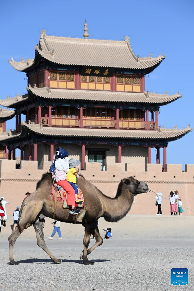 Tourists ride on a camel outside the Jiayu Pass in Jiayuguan City, northwest China's Gansu Province, Aug. 7, 2023. The Jiayu Pass, a famed part of the Great Wall built in the Ming Dynasty (1368-1644), has attracted an increasing number of visitors during the summer tourist season with over 30,000 visitors daily at peak. (Xinhua/Fan Peishen)