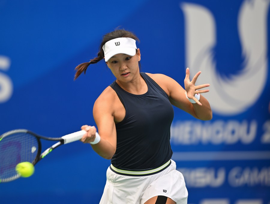 China's Guo Yuhan hits a return during the tennis women's singles final against Yang Ya-yi of Chinese Taipei at the Chengdu Universiade, August 6, 2023. (Xinhua/Liu Lei)