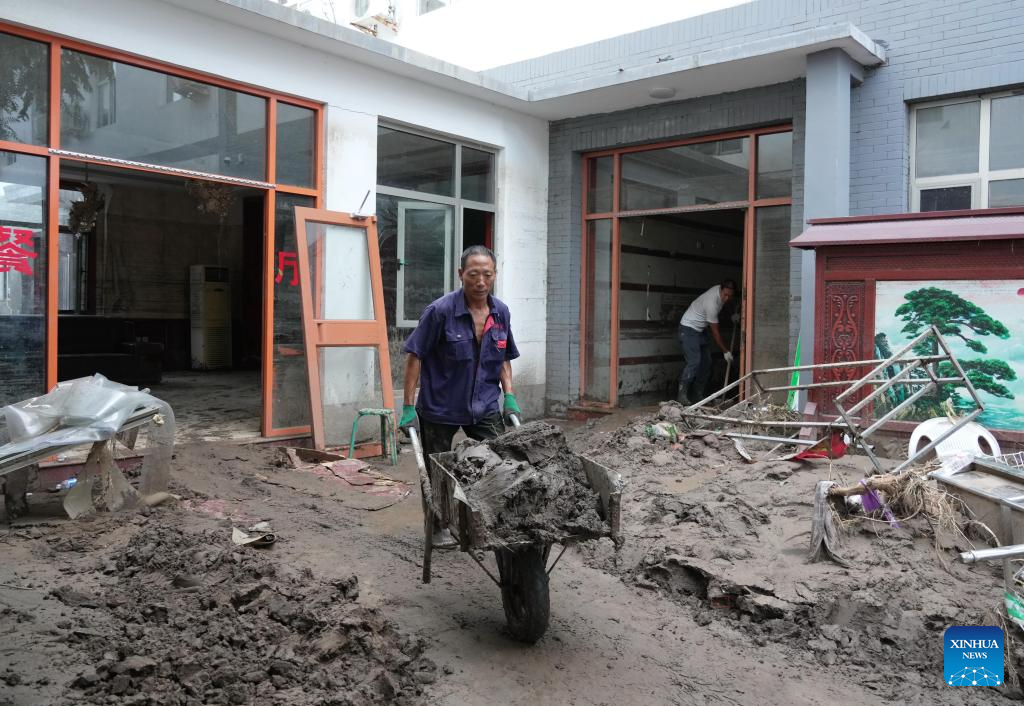 Villagers clean up slit in their yard in Xiazhuang Village, Sanpo Town, Laishui County, in north China's Hebei Province, Aug. 8, 2023. Affected by Typhoon Doksuri, Laishui County suffered heavy rainfall recently and some villages encountered traffic and communication disruptions. At present, the local authorities are mending infrastructure damaged by flood to bring life back to normal as soon as possible. (Xinhua/Yang Shiyao)