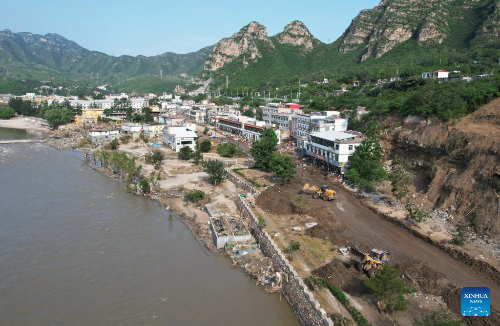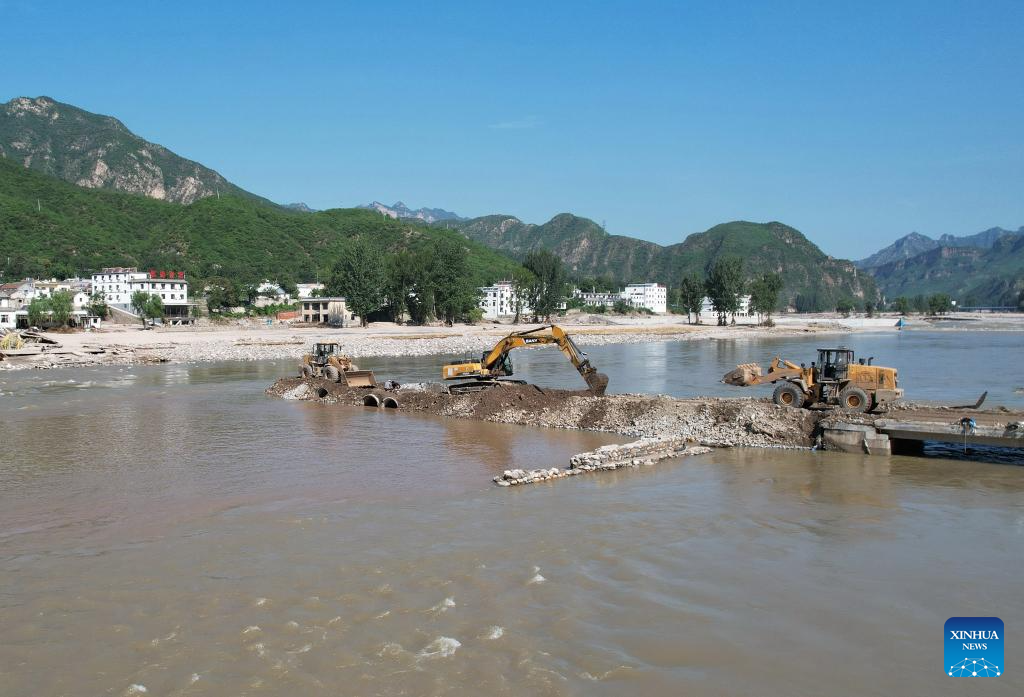 This aerial photo shows workers operating machinery to repair a bridge to Shangzhuang Village, Sanpo Town, Laishui County, in north China's Hebei Province, Aug. 8, 2023. Affected by Typhoon Doksuri, Laishui County suffered heavy rainfall recently and some villages encountered traffic and communication disruptions. At present, the local authorities are mending infrastructure damaged by flood to bring life back to normal as soon as possible. (Xinhua/Yang Shiyao)