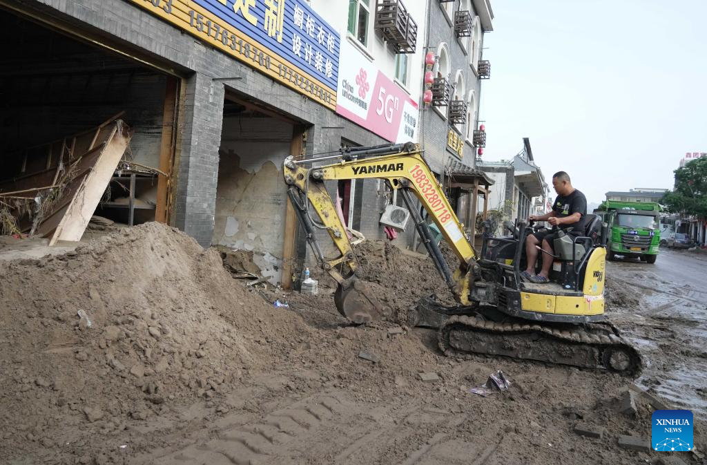 A volunteer operates machinery to clean up silt on the road in Xiazhuang Village, Sanpo Town, Laishui County, in north China's Hebei Province, Aug. 8, 2023. Affected by Typhoon Doksuri, Laishui County suffered heavy rainfall recently and some villages encountered traffic and communication disruptions. At present, the local authorities are mending infrastructure damaged by flood to bring life back to normal as soon as possible. (Xinhua/Yang Shiyao)
