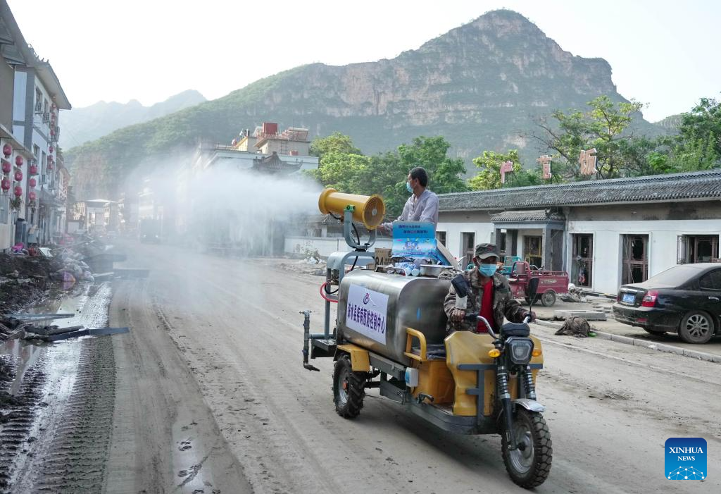 Volunteers conduct disinfection in Xiazhuang Village, Sanpo Town, Laishui County, in north China's Hebei Province, Aug. 8, 2023. Affected by Typhoon Doksuri, Laishui County suffered heavy rainfall recently and some villages encountered traffic and communication disruptions. At present, the local authorities are mending infrastructure damaged by flood to bring life back to normal as soon as possible. (Xinhua/Yang Shiyao)